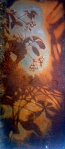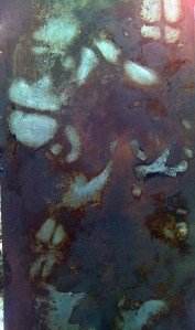 At the start of the In Memory of Missing Trees project I wanted to find a way to make the paintings disappear and re-appear like the shadows of the trees. The original idea was to use a retroreflective material which would mean the painting would only be visible with the light behind the viewer or through a flash photograph. This turned out to be incredibly expensive. I continued experimenting with glazes and other ideas, but the idea struck me as I was driving to Torun, that if I can get a sheet of steel, paint it with wax like an etching plate, and then instead of scraping and dipping in acid, I could wash away the wax and leave the exposed areas to rust in the rain. I didn’t get round to finding the steel until I took friends Asia and Piotr to Asai’s parents to get some furniture, after an hilarious birthday party and a memorable visit I was given some sheets of steel. I experimented with these with unsatisfactory results. Skip forward 6 months and I was working in a warehouse/anitque shop in London, we took down some metal shelves, they were beautiful big rusty sheets, perfect, except I was in the hell hole of London. Skip a few more months and back in Manchester. It was a hot day and I was looking after the 20 plus three project, I spent the day sanding down a couple of the sheets, then polishing with wire wool to take all the rust off. It was very sunny and the sunshine reflecting off the steel triggered my iritis and I went blind for a couple of weeks. I tried the wax resist approach again, one with beeswax another with damar, I then encouraged