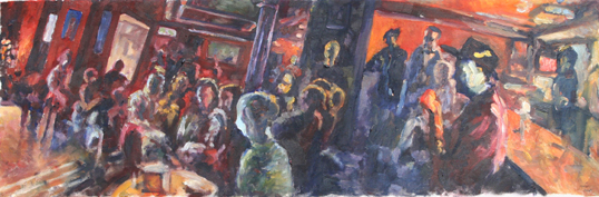The problem is, that under a street light, or lights in a night club, its not darkness that’s the problem, but the fact that different colours are filtered and appear the same colour. This usually means that green doesn’t look green anymore. Green is the biggest problem, because if green light is filtered out of the scene you are looking at, it shouldn’t be in the painting, but, green is the easiest colour to mix by accident, and if you have a tiny bit of blue on the brush, it can turn any yellows you want to mix into greens, and then, being in the funny light, you don’t know it! So beware!